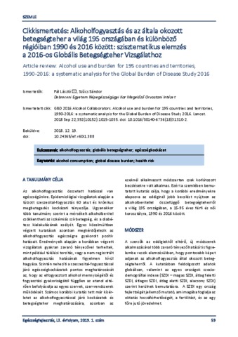 Pál, László and Szűcs, Sándor (2019) Cikkismertetés: Alkoholfogyasztás és az általa okozott betegségteher a világ 195 országában és különböző régióiban 1990 és 2016 között: szisztematikus elemzés a 2016-os Globális Betegségteher Vizsgálathoz = Article review: Alcohol use and burden for 195 countries and territories, 1990-2016: a systematic analysis for the Global Burden of Disease Study 2016. EGÉSZSÉGFEJLESZTÉS, 60 (1). pp. 59-60. ISSN 1786-2434 (nyomtatott); 2498-6666 (elektronikus)