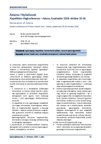 Bíróné Asbóth, Katalin (2019) Astana-i Nyilatkozat : Alapellátási világkonferencia –Astana, Kazahsztán 2018. október 25-26. = Declaration of Astana : Global Conference on Primary Health Care - Astana, Kazakhstan 25-26 October 2018. EGÉSZSÉGFEJLESZTÉS, 60 (1). pp. 51-52. ISSN 1786-2434 (nyomtatott); 2498-6666 (elektronikus)