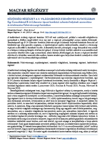 A hadtörténeti örökség régészeti kutatása 2025-től már szabályozott: például a második világháborús nyomoknak a földben megőrződött része ma már a régészeti jelenségekkel azonos módon feltárandó. Tanulmányunk egy B-24 Liberator bombázó fehérvárcsurgói lezuhanási helyének kutatásán keresztül ad betekintést egy elég speciális szegmens, a repülésrégészet sajátos módszertanába, annak is a közösségi régészeti eszközökkel is kutatható részébe. A dinamikus harctéri jelenségek, a nagy kiterjedésű roncszónák és a hiányos iratanyag komplex értelmezést igényel. A terepi leletek, levéltári adatok és visszaemlékezések összevetése lehetővé tette a gép azonosítását, amely különös felelősséggel jár, hiszen a régészeti koroktól eltérően itt a leletekhez nemcsak ritka esetben, hanem minden egyes helyszínen konkrét személyek és róluk információt váró leszármazottak kapcsolódnak.