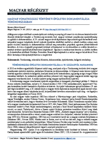 A Magyarországon található oszmán építészeti örökség viszonylag jól ismert és részletesen kutatott terület. Kevésbé felderített témakör a Törökország területén lévő, magyar történeti vonatkozású épületállomány vizsgálata és dokumentálása. A 20. századi magyar-török diplomáciai kapcsolatok egyik kiemelkedő eredményeként magyar tulajdonba került rodostói fejedelmi ebédlőház mellett az elmúlt években számos más épület részletes kutatása és dokumentálása valósult meg nemzetközi projektek, egyetemi felmérőtáborok keretében. Az írás a legújabb programok történeti előzményével és részletesebben az erdélyi követek isztambuli történeti épületének felmérésével foglalkozik. Ugyanezt a módszertant követve az utóbbi években az Isztambulban található Feriköyi Protestáns Temető kápolnájának és a milasi magyar házak közül Fevzi Beler kormányzó kúriájának felmérése is megtörtént.