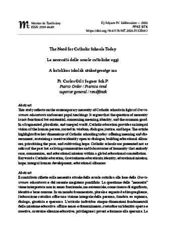 Gil i Saguer, Carles (2026) The Need for Catholic Schools Today = La necessità delle scuole cattoliche oggi = A katolikus iskolák szükségessége ma. MESTER ÉS TANÍTVÁNY, 4 (klsz). pp. 41-48. ISSN 1785-4342