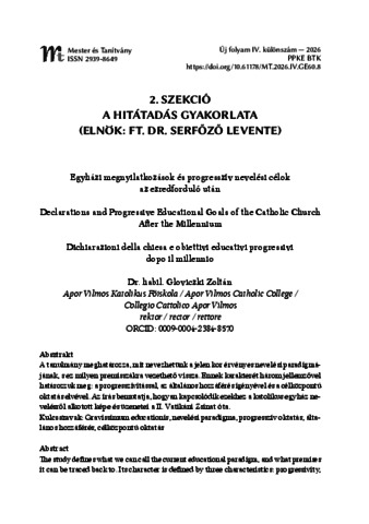 Gloviczki, Zoltán (2026) Egyházi megnyilatkozások és progresszív nevelési célok az ezredforduló után = Declarations and Progressive Educational Goals of the Catholic Church After the Millennium = Dichiarazioni della chiesa e obiettivi educativi progressivi dopo il millennio. MESTER ÉS TANÍTVÁNY, 4 (klsz). pp. 131-136. ISSN 1785-4342