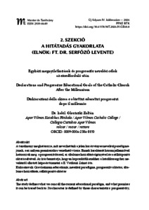A tanulmány meghatározza, mit nevezhetünk a jelen kor érvényes nevelési paradigmájának, s ez milyen premisszákra vezethető vissza. Ennek karakterét három jellemzővel határozzuk meg: a progresszivitással, az általános hozzáférés igényével és a célközpontú oktatás elvével. Az írás bemutatja, hogyan kapcsolódik ezekhez a katolikus egyház nevelésről alkotott képe és üzenetei a II. Vatikáni Zsinat óta. | The study defines what we can call the current educational paradigm, and what premises it can be traced back to. Its character is defined by three characteristics: progressivity the need for universal access, and the principle of learning outcomes in the education. The paper shows how the Catholic Church’s vision and messages on education since the Second Vatican Council are related to these. | Lo studio definisce quello che possiamo chiamare il paradigma educativo attuale e quali premesse lo possono far risalire. Il suo carattere è definito da tre caratteristiche: progressività, necessità di accesso universale e principio di educazione finalizzata. L’articolo mostra come la visione e i messaggi della Chiesa cattolica sull’educazione a partire dal Concilio Vaticano II siano correlati a queste