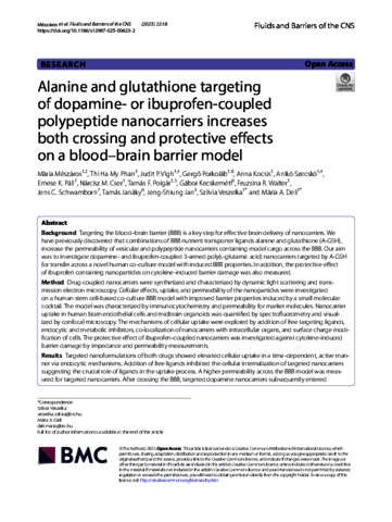 Mészáros, Mária and Phan, Thi Ha My and Vigh, Judit Piroska and Porkoláb, Gergő and Kocsis, Anna and Szecskó, Anikó and Páli, Emese Kincső and Cser, Nárcisz Mónika and Polgár, Tamás Ferenc and Kecskeméti, Gábor and Walter, Fruzsina and Schwamborn, Jens C. and Janáky, Tamás and Jan, Jeng-Shiung and Veszelka, Szilvia and Deli, Mária Anna (2025) Alanine and glutathione targeting of dopamine- or ibuprofen-coupled polypeptide nanocarriers increases both crossing and protective effects on a blood–brain barrier model. FLUIDS AND BARRIERS OF THE CNS, 22 (1). No. 18. ISSN 2045-8118
