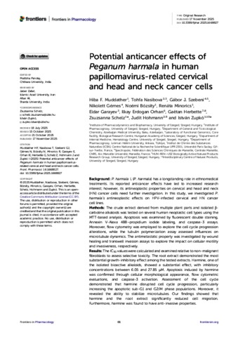 Abdallah, Hiba Faroug Muddather and Nasibova, Tohfa and Szebeni, Gábor and Gémes, Nikolett and Bózsity-Faragó, Noémi and Minorics, Renáta and Garayev, Eldar and Orhan, Ilkay Erdogan and Herbette, Gaëtan and Schelz, Zsuzsanna and Hohmann, Judit and Zupkó, István (2025) Potential anticancer effects of Peganum harmala in human papillomavirus-related cervical and head and neck cancer cells. FRONTIERS IN PHARMACOLOGY, 16. ISSN 1663-9812