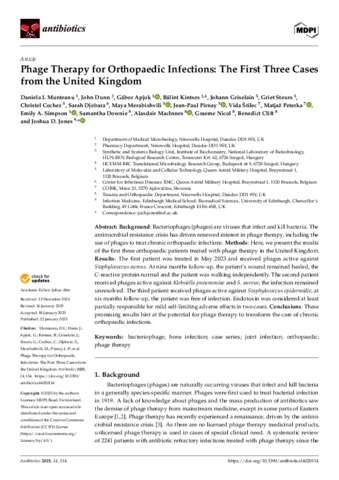 Munteanu, Daniela I. and Dunn, John and Apjok, Gábor and Kintses, Bálint and Griselain, Johann and Steurs, Griet and Cochez, Christel and Djebara, Sarah and Merabishvili, Maya and Pirnay, Jean-Paul and Štilec, Vida and Peterka, Matjaž and Simpson, Emily A. and Downie, Samantha and MacInnes, Alasdair and Nicol, Graeme and Clift, Benedict and Jones, Joshua D. (2025) Phage Therapy for Orthopaedic Infections: The First Three Cases from the United Kingdom. ANTIBIOTICS, 14 (2). No. 114. ISSN 2079-6382