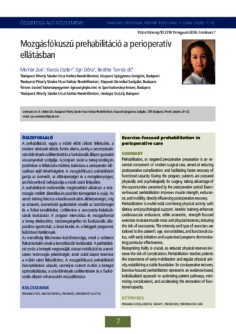 Molnár, Zoé and Kocsis, Eszter and Egri, Dóra and Beöthe, Tamás Zsolt (2026) Mozgásfókuszú prehabilitáció a perioperatív ellátásban = Exercise-focused prehabilitation in perioperative care. MAGYAR UROLÓGIA, 38 (1). pp. 7-10. ISSN 0864-8921
