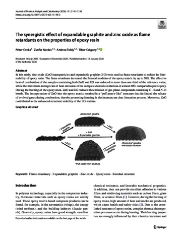 Csvila, Péter and Kovács, Zsófia and Toldy, Andrea and Czigany, Tibor (2026) The synergistic effect of expandable graphite and zinc oxide as flame retardants on the properties of epoxy resin. JOURNAL OF THERMAL ANALYSIS AND CALORIMETRY, 151. pp. 2141-2156. ISSN 1388-6150 (print);1588-2926 (online)