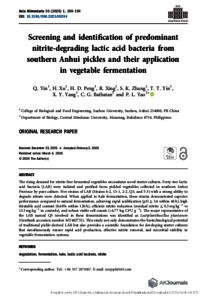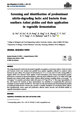 Yin, Q. and Xu, H. and Peng, H. D. and Xing, R. and Zhang, S. K. and Yin, T. T. and Yang, X. Y. and Batbatan, C. G. and Yao, P. L. (2026) Screening and identification of predominant nitrite-degrading lactic acid bacteria from southern Anhui pickles and their application in vegetable fermentation. ACTA ALIMENTARIA: AN INTERNATIONAL JOURNAL OF FOOD SCIENCE, 55 (1). pp. 180-194. ISSN 0139-3006