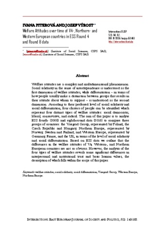Piterová, Ivana and Výrost, Jozef (2019) Welfare Attitudes over time of V4-, Northern- and Western European countries in ESS Round 4 and Round 8 data. INTERSECTIONS: EAST EUROPEAN JOURNAL OF SOCIETY AND POLITICS, 5 (1). pp. 143-162. ISSN 2416-089X
