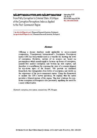 Madlovics, Bálint and Magyar, Balint (2019) From Petty Corruption to Criminal State: A Critique of the Corruption Perceptions Index as Applied to the Post-Communist Region. INTERSECTIONS: EAST EUROPEAN JOURNAL OF SOCIETY AND POLITICS, 5 (2). pp. 103-129. ISSN 2416-089X