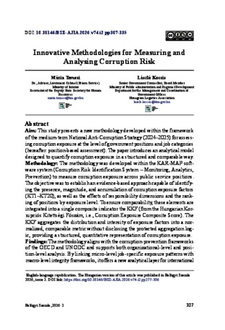Temesi, Mária and Kovács, László (2026) Innovative Methodologies for Measuring and Analysing Corruption Risk. BELÜGYI SZEMLE / ACADEMIC JOURNAL OF INTERNAL AFFAIRS: A BELÜGYMINISZTÉRIUM SZAKMAI TUDOMÁNYOS FOLYÓIRATA (2010-), 74 (2). pp. 307-335. ISSN 2062-9494