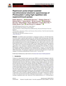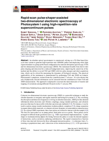 Singhal, Sumit and Akhtar, Parveen and Sarlós, Ferenc and Sipka, Gábor and Sipos, Áron and Jójárt, Péter and Gilicze, Barnabás and Seres, Imre and Bengery, Zsolt Gábor and Do, Thanh Nhut and Tan, Howe-siang and Lambrev, Petar (2025) Rapid-scan pulse-shaper-assisted two-dimensional electronic spectroscopy of Photosystem I using high-repetition-rate supercontinuum pulses. OPTICS EXPRESS, 33 (26). pp. 53851-53866. ISSN 1094-4087