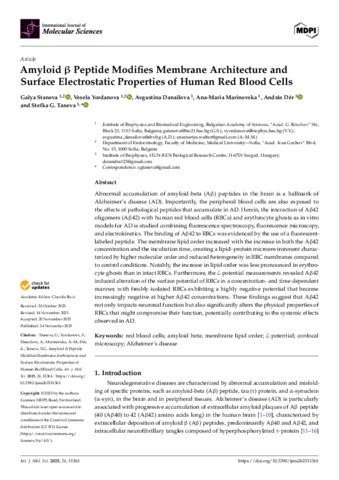 Staneva, Galya and Yordanova, Vesela and Danailova, Avgustina and Marinovska, Ana-Maria and Dér, András and Taneva, Stefka G. (2025) Amyloid β Peptide Modifies Membrane Architecture and Surface Electrostatic Properties of Human Red Blood Cells. INTERNATIONAL JOURNAL OF MOLECULAR SCIENCES, 26 (23). No. 11361. ISSN 1661-6596