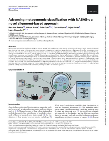 Takács, Bertalan Vilmos and Jaksa, Gabor and Qorri, Erda and Gyuris, Zoltan and Pinter, Lajos and Haracska, Lajos (2025) Advancing metagenomic classification with NABAS plus: a novel alignment-based approach. NAR GENOMICS AND BIOINFORMATICS, 7 (3). No. lqaf092. ISSN 2631-9268