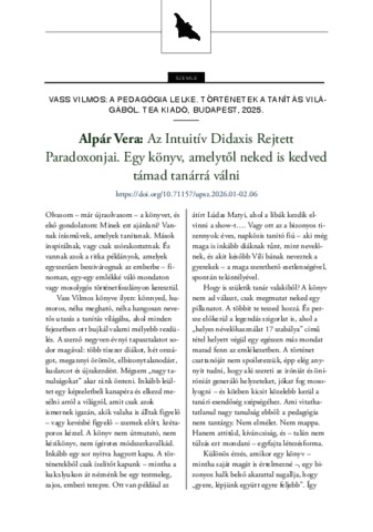Alpár, Vera (2026) Az Intuitív Didaxis Rejtett Paradoxonjai. Egy könyv, amelytől neked is kedved támad tanárrá válni : VASS VILMOS: A PEDAGÓGIA LELKE. TÖRTÉNETEK A TANÍTÁS VILÁGÁBÓL. TEA KIADÓ, BUDAPEST, 2025. ÚJ PEDAGÓGIAI SZEMLE, 76 (1-2). pp. 94-95. ISSN 1215-1807