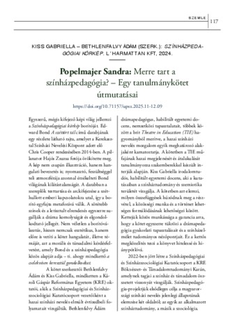 Popelmajer, Sandra (2025) Merre tart a színházpedagógia? : Egy tanulmánykötet útmutatásai KISS GABRIELLA – BETHLENFALVY ÁDÁM (SZERK.): SZ ÍNHÁZPEDAGÓGIAI KÖRKÉP. L ’ HARMATTAN KFT, 2024. ÚJ PEDAGÓGIAI SZEMLE, 75 (11-12). pp. 117-120. ISSN 1215-1807