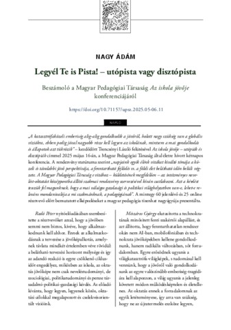 Nagy, Ádám (2025) Legyél Te is Pista! – utópista vagy disztópista : Beszámoló a Magyar Pedagógiai Társaság Az iskola jövője konferenciájáról. ÚJ PEDAGÓGIAI SZEMLE, 75 (5-6). pp. 120-125. ISSN 1215-1807