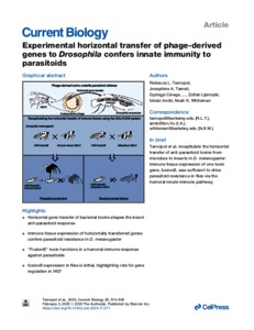 Tarnopol, Rebecca L. and Tamsil, Josephine A. and Cinege, Gyöngyi Ilona and Ha, Ji Heon and Verster, Kirsten I. and Ábrahám, Edit and Magyar, Lilla Brigitta and Kim, Bernard Y. and Bernstein, Susan L. and Lipinszki, Zoltán and Andó, István and Whiteman, Noah K. (2025) Experimental horizontal transfer of phage-derived genes to Drosophila confers innate immunity to parasitoids. CURRENT BIOLOGY, 35 (3). 514-529.e7. ISSN 0960-9822