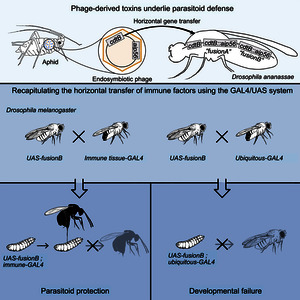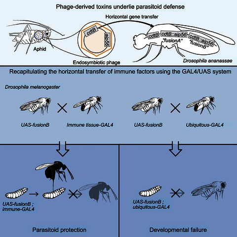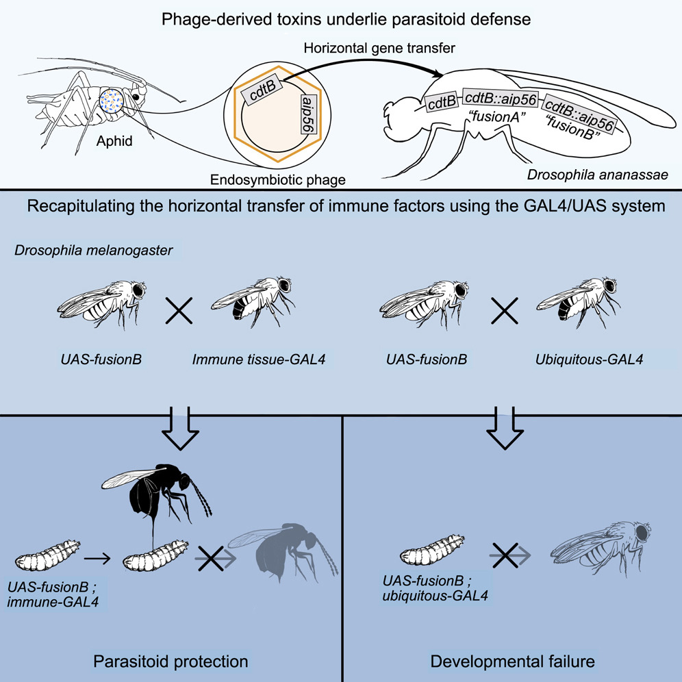 Metazoan parasites have played a major role in shaping innate immunity in animals. Insect hosts and parasitoid wasps are excellent models for illuminating how animal innate immune systems have evolved to neutralize these enemies. One such strategy relies on symbioses between insects and intracellular bacteria that express phage-encoded toxins. In some cases, the genes that encode these toxins have been horizontally transferred to the genomes of the insects. Here, we used genome editing in Drosophila melanogaster to recapitulate the evolution of two toxin genes—cytolethal distending toxin B (cdtB) and apoptosis inducing protein of 56kDa (aip56)—that were horizontally transferred likely from phages of endosymbiotic bacteria to insects millions of years ago. We found that a cdtB::aip56 fusion gene (fusionB), which is conserved in D. ananassae subgroup species, dramatically promoted fly survival and suppressed parasitoid wasp development when heterologously expressed in D. melanogaster immune tissues. We found that FusionB was a functional nuclease and was secreted into the host hemolymph where it targeted the parasitoid embryo's serosal tissue. Although the mechanism of toxicity remains unknown, when expressed ubiquitously, fusionB resulted in delayed development of late-stage fly larvae and eventually killed pupating flies. These results point to the salience of regulatory constraint in mitigating autoimmunity during the domestication process following horizontal transfer. Our findings demonstrate how horizontal gene transfer can instantly provide new, potent innate immune modules in animals. © 2024 The Author(s)