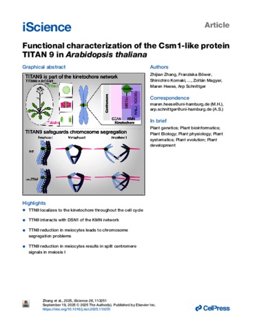 Zhang, Zhijian and Boewer, Franziska and Komaki, Shinichiro and Pettkó-Szandtner, Aladár and Skuba, Anastasiia O. and Tromer, Eelco C. and Magyar, Zoltán and Heese, Maren and Schnittger, Arp (2025) Functional characterization of the Csm1-like protein TITAN 9 in Arabidopsis thaliana. ISCIENCE, 28 (9). No. 113251. ISSN 2589-0042