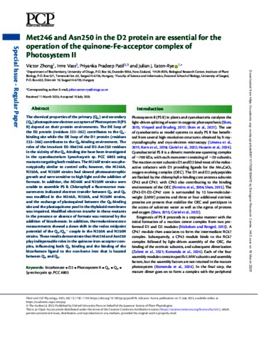 Zhong, Victor and Vass, Imre and Patil, Priyanka Pradeep and Eaton-Rye, Julian J (2025) Met246 and Asn250 in the D2 Protein are Essential for the Operation of the Quinone-Fe-Acceptor Complex of Photosystem II. PLANT AND CELL PHYSIOLOGY, 66 (11). pp. 1730-1749. ISSN 0032-0781