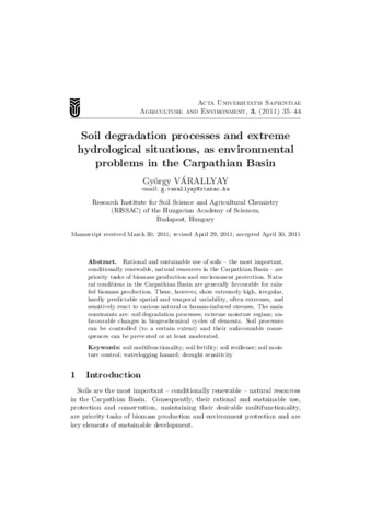 Várallyay, György (2011) Soil degradation processes and extreme soil moisture events as environmental problems in the Carpathian Basin. ACTA UNIVERSITATIS SAPIENTIAE AGRICULTURE AND ENVIRONMENT, 3. pp. 35-44. ISSN 2065-748X