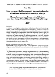 A tanulmány a poszt-bipoláris rendben történő kisállami nemzetközi érdekérvényesítés egy példáját vizsgálja, a magyar-amerikai konzervatív kapcsolatokat kormányzati és nem-kormányzati szinten egyaránt 2014-től 2025-ig. Az esettanulmányok keresztül az írás be kívánja mutatni, hogyan képes egy kisállam tudatos, újszerű kapcsolatépítéssel jelentős befolyást szerezni és szoros kapcsolatot kialakítani egy nagyhatalommal. Az asszimetrikus igazodás fogalmi keretében egy kisállam materiális erőt nem tud felhasználni, így a soft power különböző eszközeivel, a médiakapcsolatok - különösképp a politikai véleményvezérek -, a háttérintézetek, valamint elit-szintű kapcsolatokon keresztül tud együttműködést és szövetséget kialakítani. A tanulmány hozzájárul a kisállami diplomácia, a soft power és a nemzetközi politikai hálózatok működésének mélyebb megértéséhez. | The study examines an example of small-state international advocacy in the post-bipolar order, Hungarian-American conservative relations at both governmental and non-governmental levels from 2014 to 2025. Through the case study, the paper aims to demonstrate how a small state can gain significant influence and establish close ties with a great power through conscious, novel relationship-building. In the conceptual framework of asymmetric alignment, a small state cannot use material power, so it can establish cooperation and alliances through various means of soft power, like media relations - especially political opinion leaders -, thinktank networks, and elite-level relations. The study contributes to a deeper understanding of small-state diplomacy, soft power, and the functioning of international political networks.