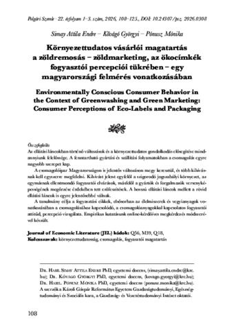 Simay, Attila Endre and Kővágó, Györgyi and Pónusz, Mónika (2026) Környezettudatos vásárlói magatartás a zöldremosás – zöldmarketing, az ökocímkék fogyasztói percepciói tükrében – egy magyarországi felmérés vonatkozásában = Environmentally Conscious Consumer Behavior in the Context of Greenwashing and Green Marketing: Consumer Perceptions of Eco-Labels and Packaging. POLGÁRI SZEMLE: GAZDASÁGI ÉS TÁRSADALMI FOLYÓIRAT, 22 (1-3). pp. 108-125. ISSN 1786-6553