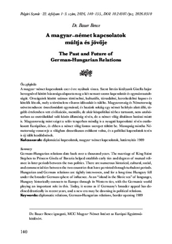 Bauer, Bence (2026) A magyar–német kapcsolatok múltja és jövője = The Past and Future of German-Hungarian Relations. POLGÁRI SZEMLE: GAZDASÁGI ÉS TÁRSADALMI FOLYÓIRAT, 22 (1-3). pp. 140-155. ISSN 1786-6553
