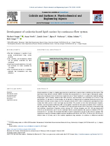 Varga, Norbert and Veréb, Anna and Seres, László and F. Várkonyi, Egon and Juhász, Ádám and Csapó, Edit (2026) Development of asolectin-based lipid carriers by continuous flow system. COLLOIDS AND SURFACES A : PHYSICOCHEMICAL AND ENGINEERING ASPECTS, 739. No. 140159. ISSN 0927-7757