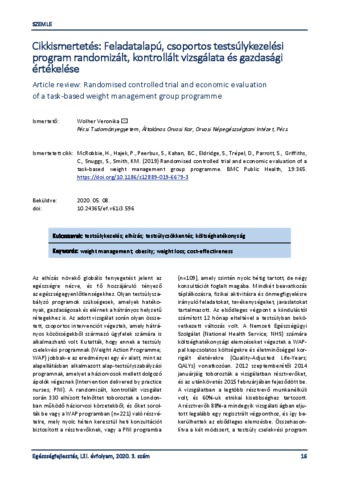 Cikkismertetés: Feladatalapú, csoportos testsúlykezelési program randomizált, kontrollált vizsgálata és gazdasági értékelése = Article review: Randomised controlled trial and economic evaluation of a task-based weight management group programme