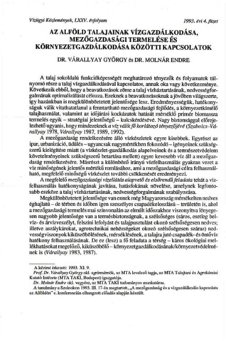 Várallyay, György and Molnár, Endre (1993) Az Alföld talajainak vízgazdálkodása, mezőgazdasági termelése és környezetgazdálkodása közötti kapcsolatok. VÍZÜGYI KÖZLEMÉNYEK, 75 (4). pp. 402-410. ISSN 0042-7616