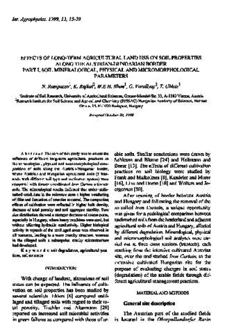 Rampazzo, N. and Rajkai, Kálmán László and Blum, WEH and Várallyay, György and Ubleis, T. (1999) Effects of long-term agricultural land use on soil properties along the Austrian-Hungarian border. Part I. Soil mineralogical, physical and micromorphological parameters. INTERNATIONAL AGROPHYSICS, 13 (1). pp. 15-39. ISSN 0236-8722