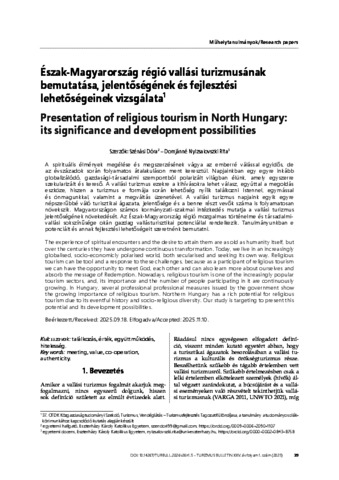 A spirituális élmények megélése és megszerzésének vágya az emberré válással egyidős, de az évszázadok során folyamatos átalakuláson ment keresztül. Napjainkban egy egyre inkább globalizálódó, gazdasági-társadalmi szempontból polarizált világban élünk, amely egyszerre szekularizált és kereső. A vallási turizmus ezekre a kihívásokra lehet válasz, egyúttal a megoldás eszköze, hiszen a turizmus e formája során lehetőség nyílik találkozni Istennel, egymással és önmagunkkal, valamint a megváltás üzenetével. A vallási turizmus napjaink egyik egyre népszerűbbé váló turisztikai ágazata, jelentősége és a benne részt vevők száma is folyamatosan növekszik. Magyarországon számos kormányzati-szakmai intézkedés mutatja a vallási turizmus jelentőségének növekedését. Az Észak-Magyarország régió mozgalmas történelme és társadalmi-vallási sokszínűsége okán gazdag vallásturisztikai potenciállal rendelkezik. Tanulmányunkban e potenciált és annak fejlesztési lehetőségeit szeretnénk bemutatni. | The experience of spiritual encounters and the desire to attain them are as old as humanity itself, but over the centuries they have undergone continuous transformation. Today, we live in an increasingly globalised, socio-economicly polarised world, both secularised and seeking its own way. Religious tourism can be tool and a response to these challenges, because as a participant of religious tourism we can have the opportunity to meet God, each other and can also learn more about ourselves and absorb the message of Redemption. Nowadays, religious tourism is one of the increasingly popular tourism sectors, and, its importance and the number of people participating in it are continuously growing. In Hungary, several professional professional measures issued by the government show the growing importance of religious tourism. Northern Hungary has a rich potential for religious tourism due to its eventful history and socio-religious diversity. Our study is targeting to present this potential and its development possibilities.