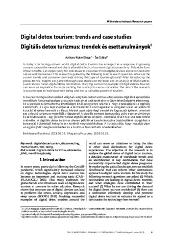 In today’s technology-driven world, digital detox tourism has emerged as a response to growing concerns about the mental and physical health effects of constant digital connectivity. This niche form of tourism offers an opportunity for individuals to disconnect from digital devices and reconnect with nature and themselves. This research is guided by the following main research question: What are the current trends and consumer demands driving this type of tourism globally? After introducing the global trends, insights are gained through case studies on the topic and an analysis of Il Monastero, a well-known Italian digital detox destination. Studying successful examples of digital detox tourism can serve as inspiration for implementing the concept in various locations. The aim of the research is to contribute to individual well-being and the sustainable growth of tourism. | A mai, technológia által vezérelt világban a digitális detox turizmus a folyamatos digitális kapcsolódás mentális és fizikai egészségre gyakorolt hatásainak csökkentésére nyújtott lehetőségként jelent meg. Ez a speciális turizmusforma lehetőséget kínál az egyének számára, hogy elszakadjanak a digitális eszközöktől, és újra kapcsolódjanak a természettel és önmagukkal. A vizsgálat során az alábbi fő kutatási kérdésre kerestük a választ: Melyek azok a jelenlegi trendek és fogyasztói igények, amelyek ezt a típusú turizmust motiválják világszerte? A globális trendek bemutatása után, esettanulmányok és az Il Monastero – egy jól ismert olasz digitális detox célpont – elemzése révén nyerünk betekintést a témába. A digitális detox turizmus sikeres példáinak tanulmányozása ösztönzőként szolgálhat a koncepció különböző helyszíneken történő megvalósításához. A kutatás célja, hogy hozzájáruljon az egyéni jóllét megteremtéséhez és a turizmus fenntartható növekedéséhez.