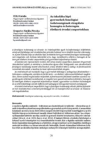 Szili, Katalin and Greguricz, Natália Piroska (2025) Az iskolába lépő gyermekek fonológiai tudatosságának vizsgálata homogén és heterogén életkorú óvodai csoportokban = An Investigation of Phonological Awareness in Preschool Children Entering School in Homoge-Neous And Heterogeneous Age-Group Kindergarten Classes. ANYANYELVI KULTÚRAKÖZVETÍTÉS, 8 (2). pp. 24-42. ISSN 2063-2991