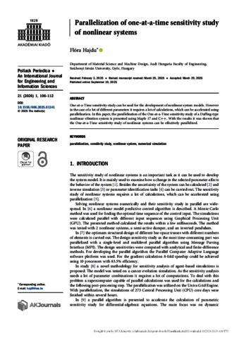 Hajdu, Flóra (2026) Parallelization of one-at-a-time sensitivity study of nonlinear systems. POLLACK PERIODICA: AN INTERNATIONAL JOURNAL FOR ENGINEERING AND INFORMATION SCIENCES, 21 (1). pp. 106-112. ISSN 1788-1994