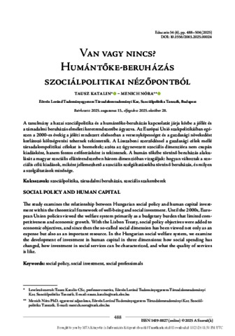 Tausz, Katalin and Menich, Nóra (2026) Van vagy nincs? Humántőke-beruházás szociálpolitikai nézőpontból = Social policy and human capital. EDUCATIO, 34 (4). pp. 488-504. ISSN 1216-3384