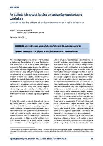 Csizmadia, Péter (2016) Az épített környezet hatása az egészségmagatartásra workshop = Workshop on the effects of built environment on health behaviour. EGÉSZSÉGFEJLESZTÉS, 57 (2). pp. 85-88. ISSN 1786-2434 (nyomtatott); 2498-6666 (elektronikus)