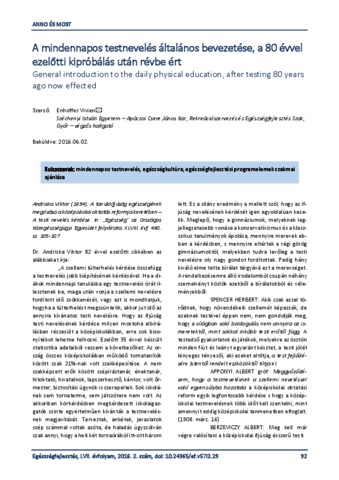 Enhoffer, Vivien (2016) A mindennapos testnevelés általános bevezetése, a 80 évvel ezelőtti kipróbálás után révbe ért = General introduction to the daily physical education, after testing 80 years ago now effected. EGÉSZSÉGFEJLESZTÉS, 57 (2). pp. 92-95. ISSN 1786-2434 (nyomtatott); 2498-6666 (elektronikus)