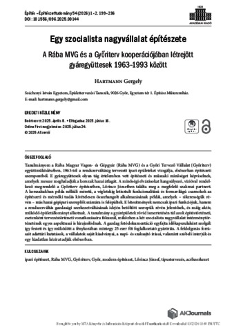 Hartmann, Gergely (2026) Egy szocialista nagyvállalat építészete : A Rába MVG és a Győriterv kooperációjában létrejött gyáregyüttesek 1963–1993 között = Architecture of a Socialist Industrial Giant : Factory Complexes Resulting from the Cooperation between Rába MVG and Győriterv, 1963–1993. ÉPÍTÉS-ÉPÍTÉSZETTUDOMÁNY, 2025 (54). ISSN 0013-9661