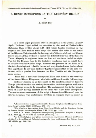 Róna-Tas, András (1976) A runic inscription in the Kujbyšev region. ACTA ORIENTALIA ACADEMIAE SCIENTIARUM HUNGARICAE, 30. pp. 267-271. ISSN 0001-6446