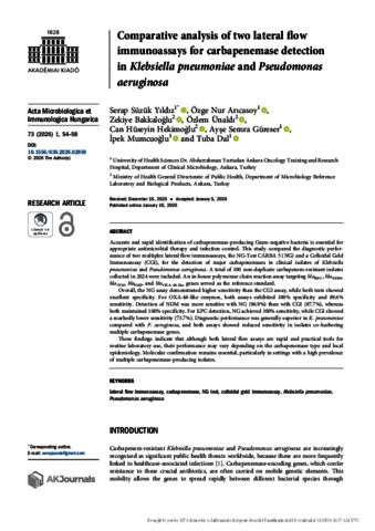 Yıldız, Serap Süzük and Arıcasoy, Özge Nur and Bakkaloğlu, Zekiye and Ünaldı, Özlem and Hekimoğlu, Can Hüseyin and Güreser, Ayşe Semra and Mumcuoğlu, İpek and Dal, Tuba (2026) Comparative analysis of two lateral flow immunoassays for carbapenemase detection in Klebsiella pneumoniae and Pseudomonas aeruginosa. ACTA MICROBIOLOGICA ET IMMUNOLOGICA HUNGARICA, 73 (1). pp. 54-58. ISSN 1217-8950