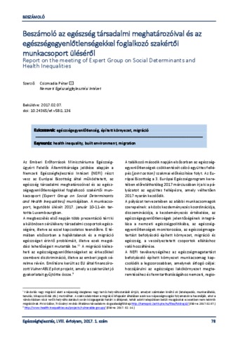 Csizmadia, Péter (2017) Beszámoló az egészség társadalmi meghatározóival és az egészségegyenlőtlenségekkel foglalkozó szakértői munkacsoport üléséről = Report on the meeting of Expert Group on Social Determinants and Health Inequalities. EGÉSZSÉGFEJLESZTÉS, 58 (1). pp. 78-79. ISSN 1786-2434 (nyomtatott); 2498-6666 (elektronikus)