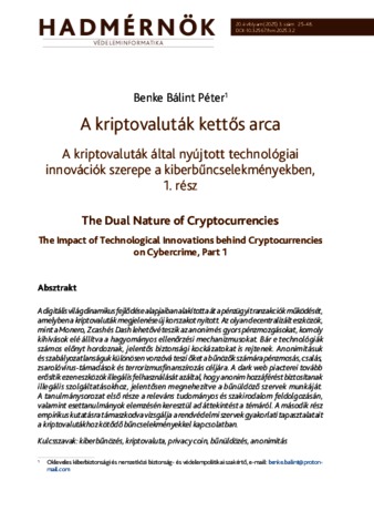 A digitális világ dinamikus fejlődése alapjaiban alakította át a pénzügyi tranzakciók működését, amelyben a kriptovaluták megjelenése új korszakot nyitott. Az olyan decentralizált eszközök, mint a Monero, Zcash és Dash lehetővé teszik az anonim és gyors pénzmozgásokat, komoly kihívások elé állítva a hagyományos ellenőrzési mechanizmusokat. Bár e technológiák számos előnyt hordoznak, jelentős biztonsági kockázatokat is rejtenek. Anonimitásuk és szabályozatlanságuk különösen vonzóvá teszi őket a bűnözők számára pénzmosás, csalás, zsarolóvírus-támadások és terrorizmusfinanszírozás céljára. A dark web piacterei tovább erősítik ezen eszközök illegális felhasználását azáltal, hogy anonim hozzáférést biztosítanak illegális szolgáltatásokhoz, jelentősen megnehezítve a bűnüldöző szervek munkáját. A tanulmánysorozat első része a releváns tudományos és szakirodalom feldolgozásán, valamint esettanulmányok elemzésén keresztül ad áttekintést a témáról. A második rész empirikus kutatásra támaszkodva vizsgálja a rendvédelmi szervek gyakorlati tapasztalatait a kriptovalutákhoz kapcsolódó bűncselekményekkel kapcsolatban. | The dynamic evolution of the digital world has fundamentally transformed the nature of financial transactions, ushering in a new era with the emergence of cryptocurrencies. Decentralized assets such as Monero, Zcash, and Dash enable fast and anonymous transfers, posing significant challenges to traditional regulatory mechanisms. While these technologies offer several benefits, they also entail serious security risks. Their anonymity and lack of oversight make them particularly attractive to criminals for activities such as money laundering, fraud, ransomware attacks, and terrorism financing. Dark web marketplaces further amplify their illicit use by facilitating anonymous access to illegal services, significantly complicating the work of law enforcement agencies. The first part of the study series provides an overview of the topic through the analysis of relevant scientific and professional literature, as well as case studies. The second part builds on empirical research to examine the practical experiences of law enforcement agencies regarding crimes related to cryptocurrencies.