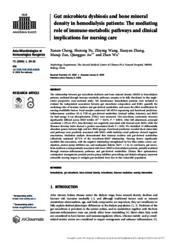 Cheng, Xunan and Pu, Shutong and Wang, Zhiying and Zhang, Xiaoyan and Zuo, Manqi and Ao, Qiangguo and Wu, Zhen (2026) Gut microbiota dysbiosis and bone mineral density in hemodialysis patients: The mediating role of immune-metabolic pathways and clinical implications for nursing care. ACTA MICROBIOLOGICA ET IMMUNOLOGICA HUNGARICA, 73 (1). pp. 20-32. ISSN 1217-8950
