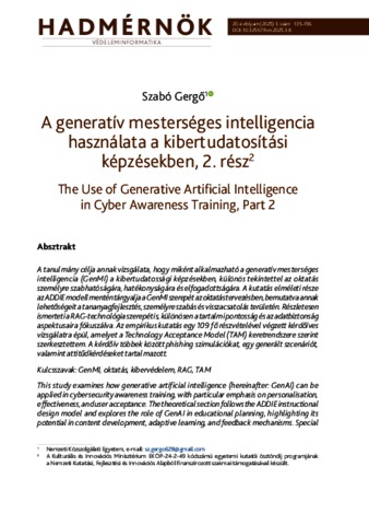 A tanulmány célja annak vizsgálata, hogy miként alkalmazható a generatív mesterséges intelligencia (GenMI) a kibertudatossági képzésekben, különös tekintettel az oktatás személyre szabhatóságára, hatékonyságára és elfogadottságára. A kutatás elméleti része az ADDIE modell mentén tárgyalja a GenMI szerepét az oktatástervezésben, bemutatva annak lehetőségeit a tananyagfejlesztés, személyre szabás és visszacsatolás területén. Részletesen ismerteti a RAG-technológia szerepét is, különösen a tartalmi pontosság és az adatbiztonság aspektusaira fókuszálva. Az empirikus kutatás egy 109 fő részvételével végzett kérdőíves vizsgálatra épül, amelyet a Technology Acceptance Model (TAM) keretrendszere szerint szerkesztettem. A kérdőív többek között phishing szimulációkat, egy generált szcenáriót, valamint attitűdkérdéseket tartalmazott. | This study examines how generative artificial intelligence (hereinafter: GenAI) can be applied in cybersecurity awareness training, with particular emphasis on personalization, effectiveness, and user acceptance. The theoretical section follows the ADDIE instructional design model and explores the role of GenAI in educational planning, highlighting its potential in content development, adaptive learning, and feedback mechanisms. Special attention is given to Retrieval-Augmented Generation (RAG) technologies, focusing on content accuracy and data protection considerations. The empirical part of the research is based on a questionnaire survey conducted with 109 participants and designed according to the Technology Acceptance Model (TAM). The questionnaire included phishing simulations, an AI-generated cybersecurity scenario, and attitude-based questions. The aim of the study is to assess how non-expert users perceive and evaluate cybersecurity training materials generated by artificial intelligence, and to identify key factors influencing their acceptance and perceived usefulness.