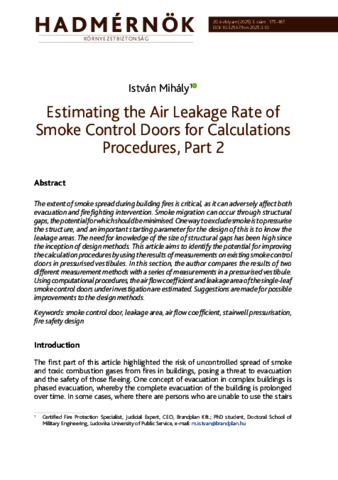 Mihály, István (2025) Estimating the Air Leakage Rate of Smoke Control Doors for Calculations Procedures, Part 2. HADMÉRNÖK, 20 (3). pp. 175-187. ISSN 1788-1919
