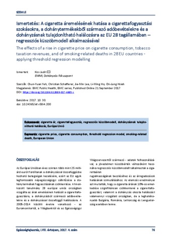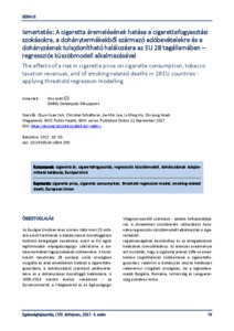 Ismertetés: A cigaretta áremelésének hatása a cigarettafogyasztási szokásokra, a dohánytermékekből származó adóbevételekre és a dohányzásnak tulajdonítható halálozásra az EU 28 tagállamában – regressziós küszöbmodell alkalmazásával = The effects of a rise in cigarette price on cigarette consumption, tobacco taxation revenues, and of smoking-related deaths in 28 EU countries -applying threshold regression modelling